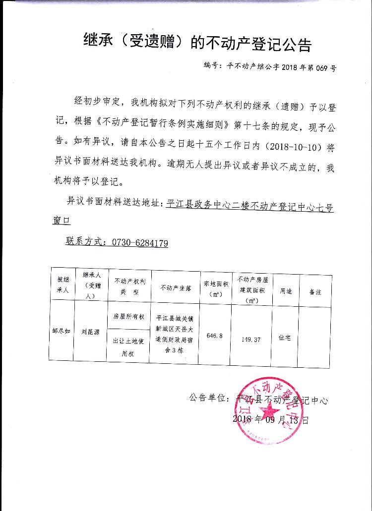 刘昆源继承(受遗赠)的不动产登记公告平不动产继公字2018年第069号