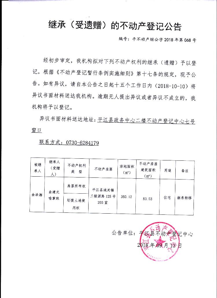 余建光 喻掌珠继承(受遗赠)的不动产登记公告平不动产继公字2018年第068号