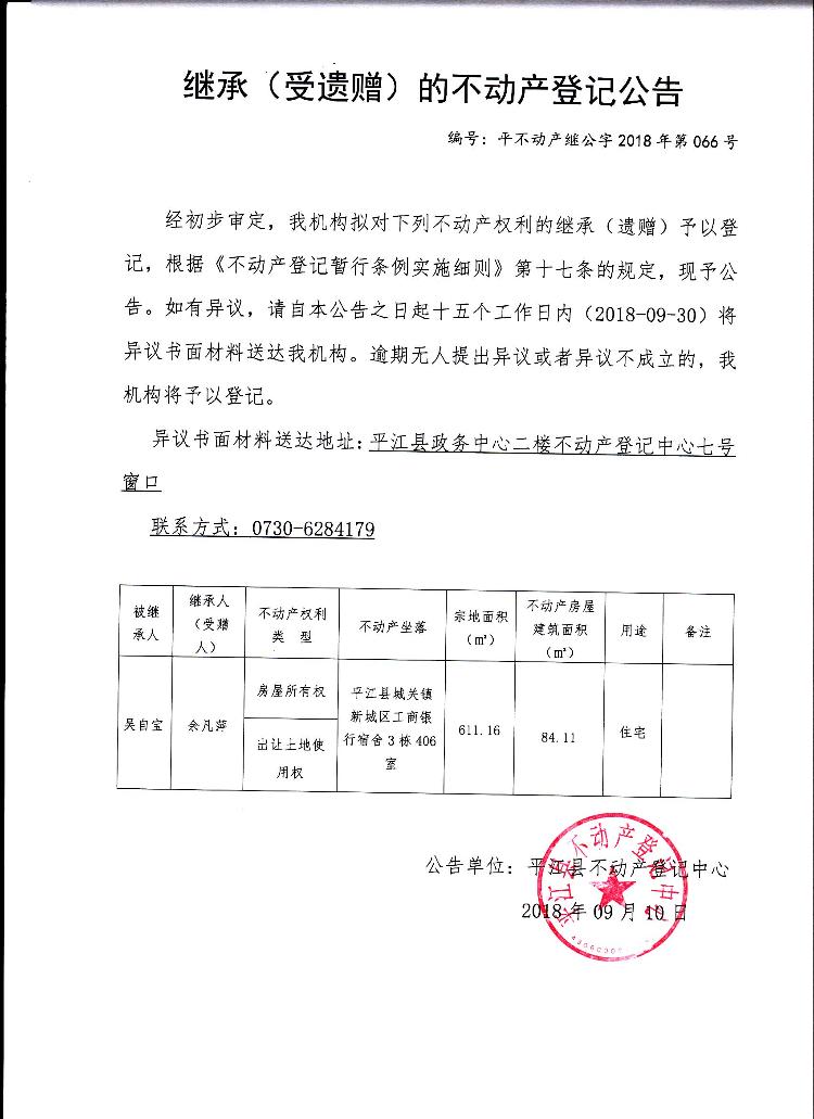 余凡萍继承(受遗赠)的不动产登记公告平不动产继公字2018年第066号