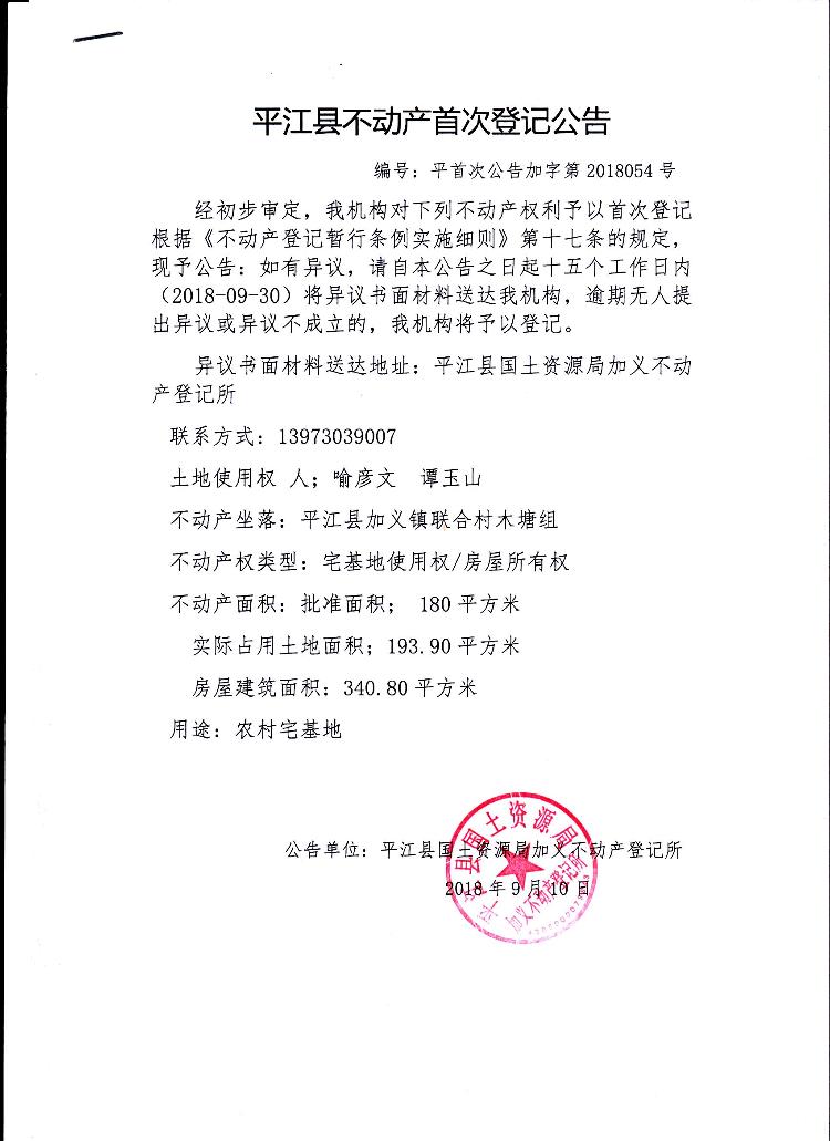 喻彦文 谭玉山不动产首次登记公告平首次公告加字第2018054号