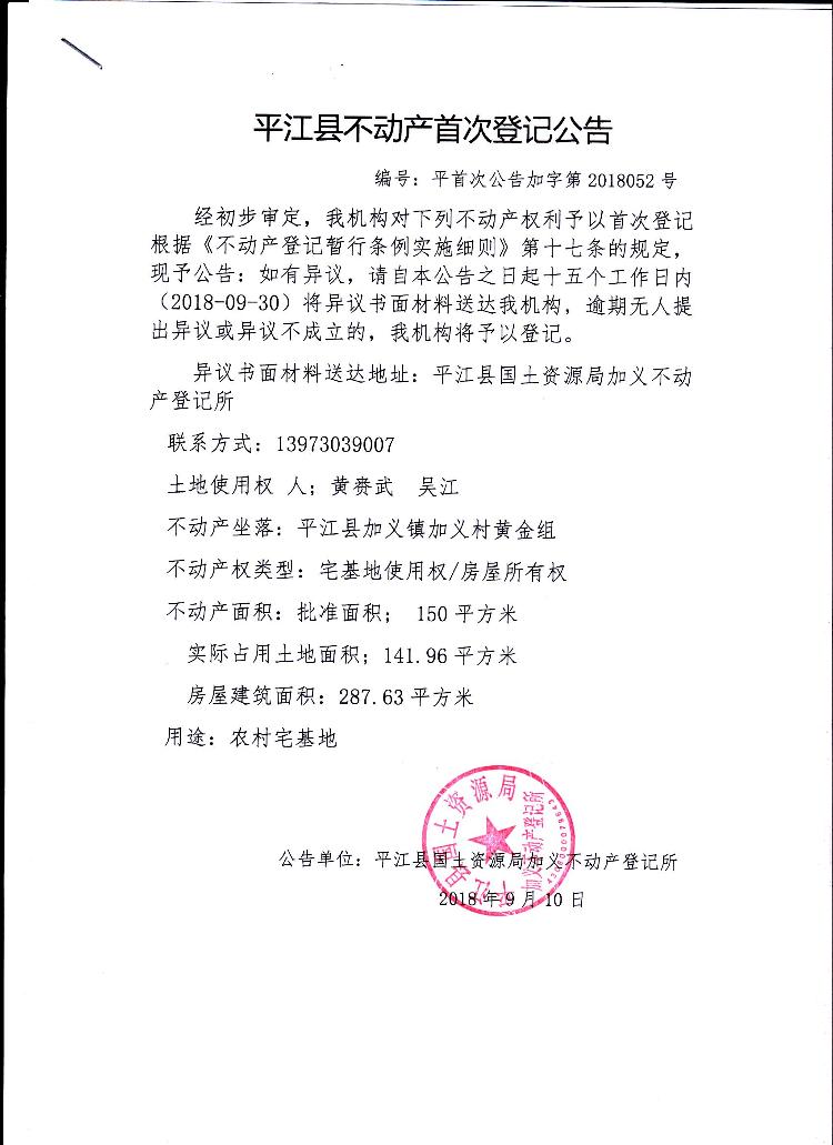黄赉武 吴江不动产首次登记公告平首次公告加字第2018052号