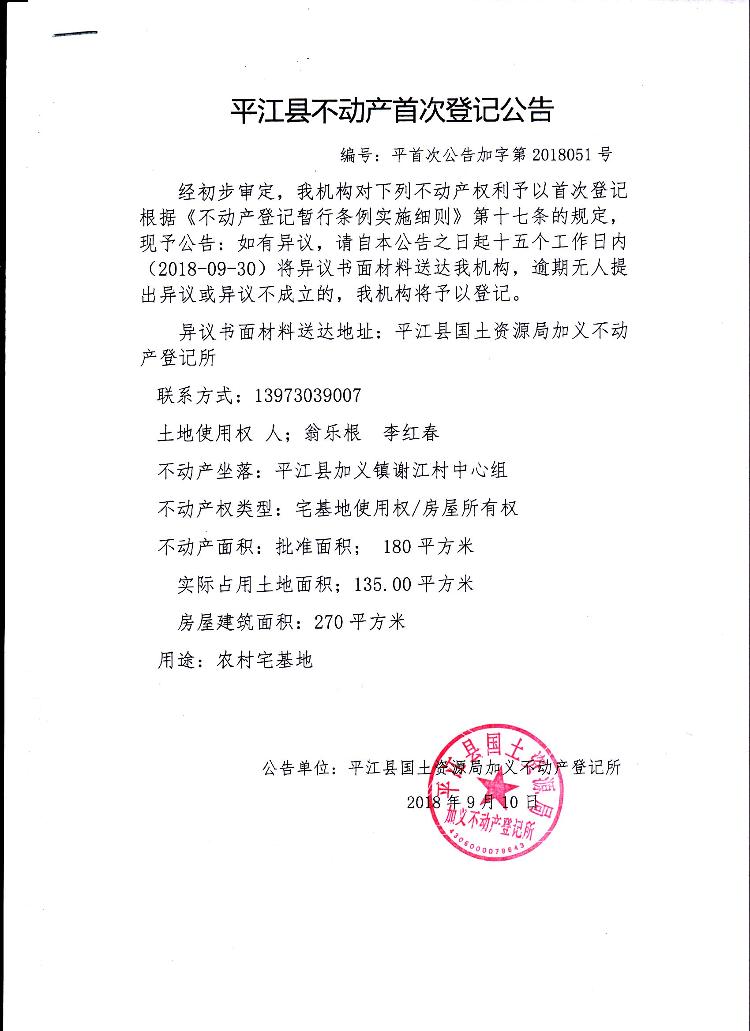 翁乐根 李红春不动产首次登记公告平首次公告加字第2018051号