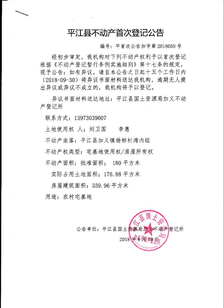 刘卫国 李惠不动产首次登记公告平首次公告加字第2018050号