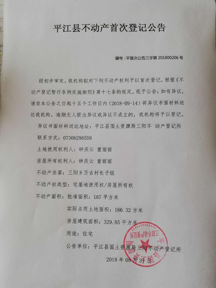 三阳乡钟庆云 童丽丽 不动产首次登记公告