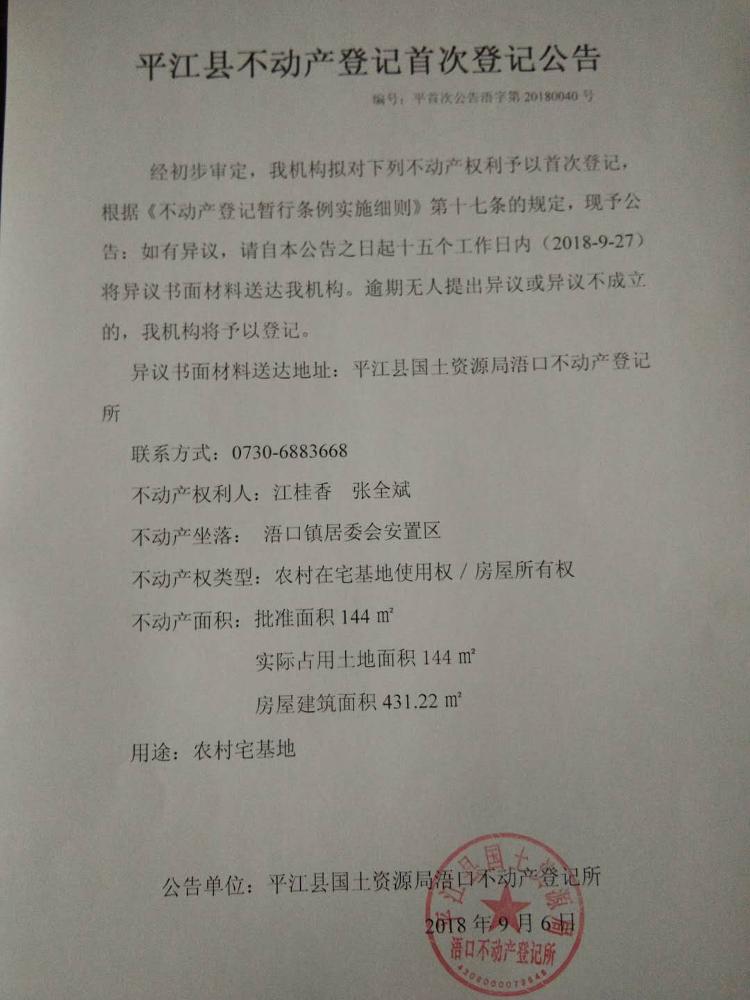 江桂香 张全斌不动产首次登记公告平首次公告浯字第20180040号