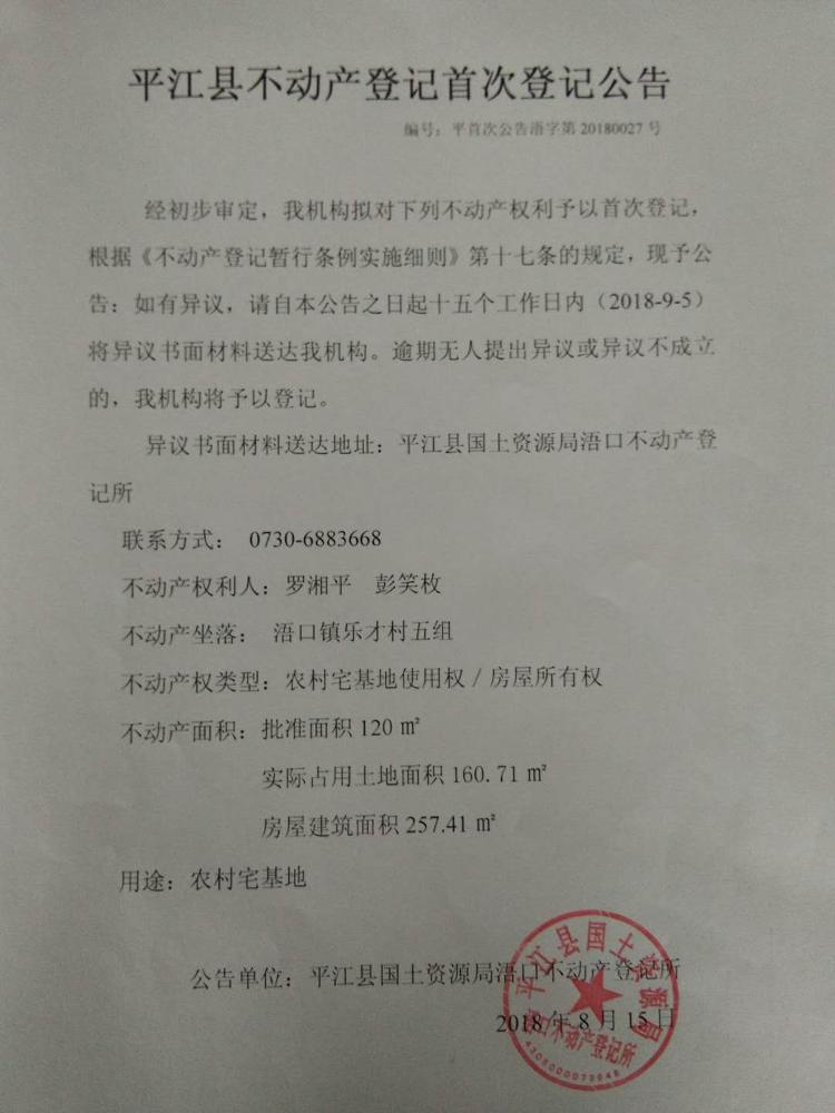 罗湘平 彭笑枚不动产首次登记公告平首次公告浯字第20180027号