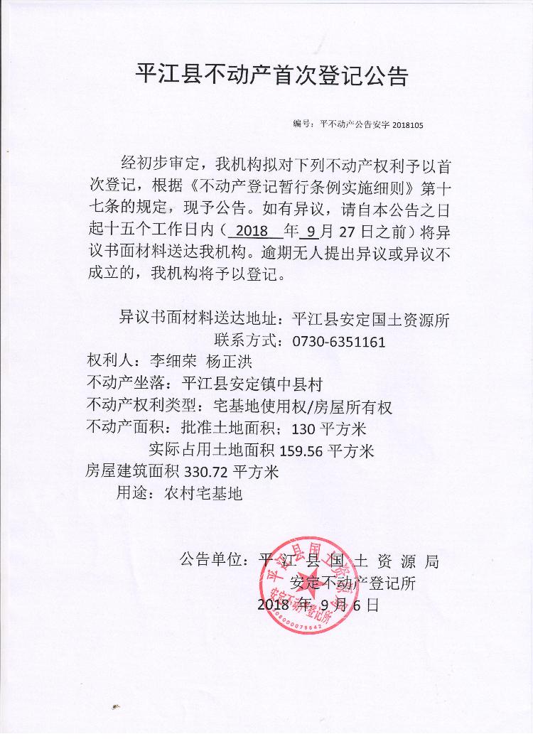 李细荣 杨正洪不动产首次登记公告 安字2018105