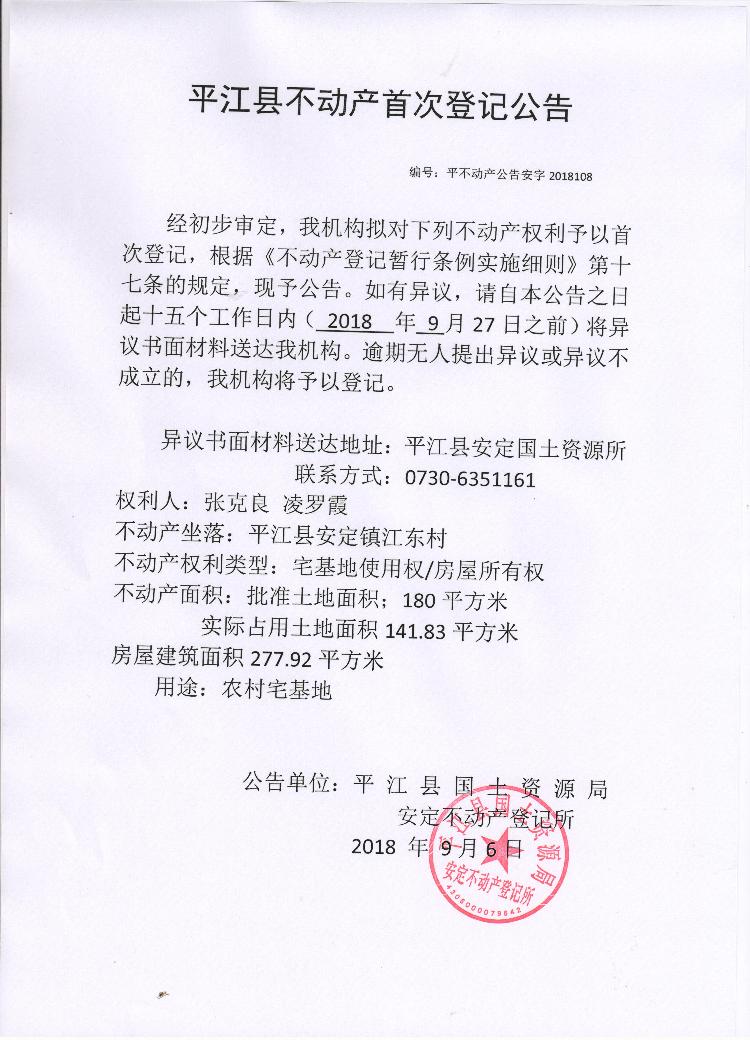 张克良 凌罗霞不动产首次登记公告 安字2018108