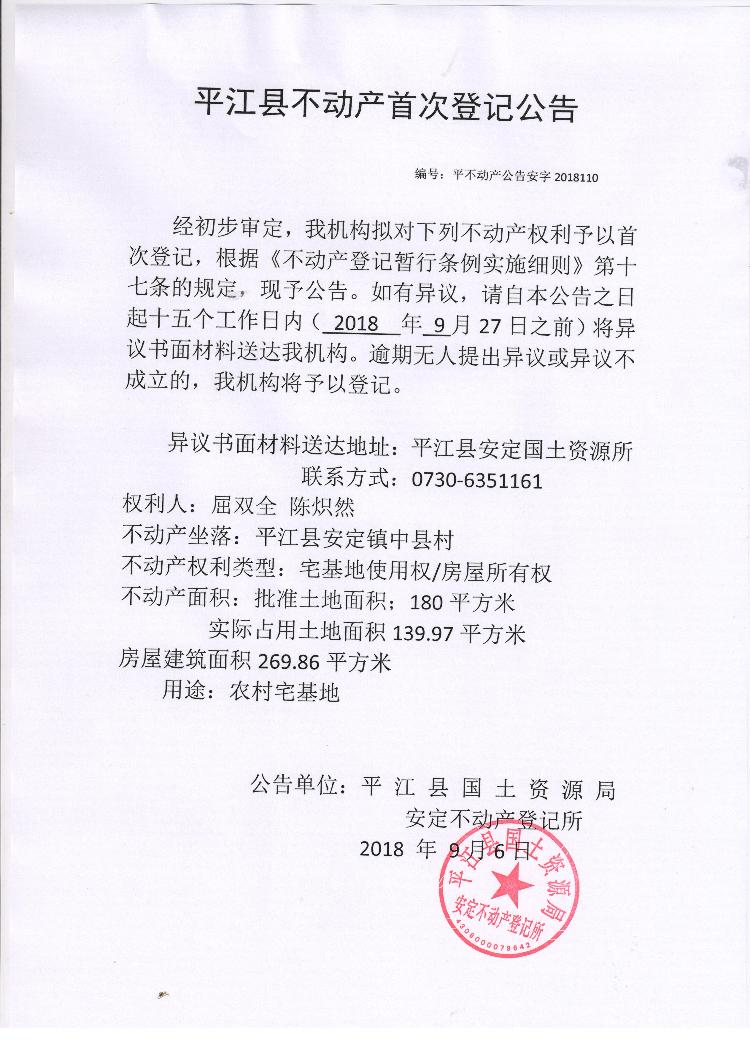 屈双全 陈炽染不动产首次登记公告 安字2018110