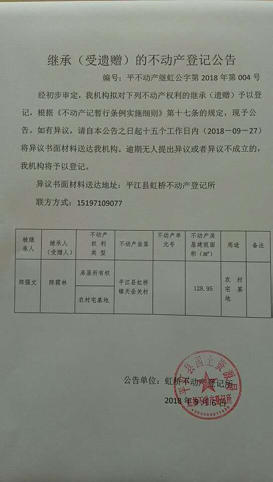 陈霞林继承(受遗赠)的不动产登记公告平不动产继虹公字第2018年第004号