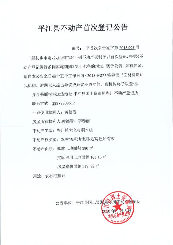 黄德智 李春丽不动产首次登记公告平首次公告岑字第2018003号
