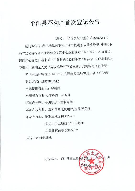 邹稳固 赵丽莎不动产首次登记公告平首次公告岑字第2018006号