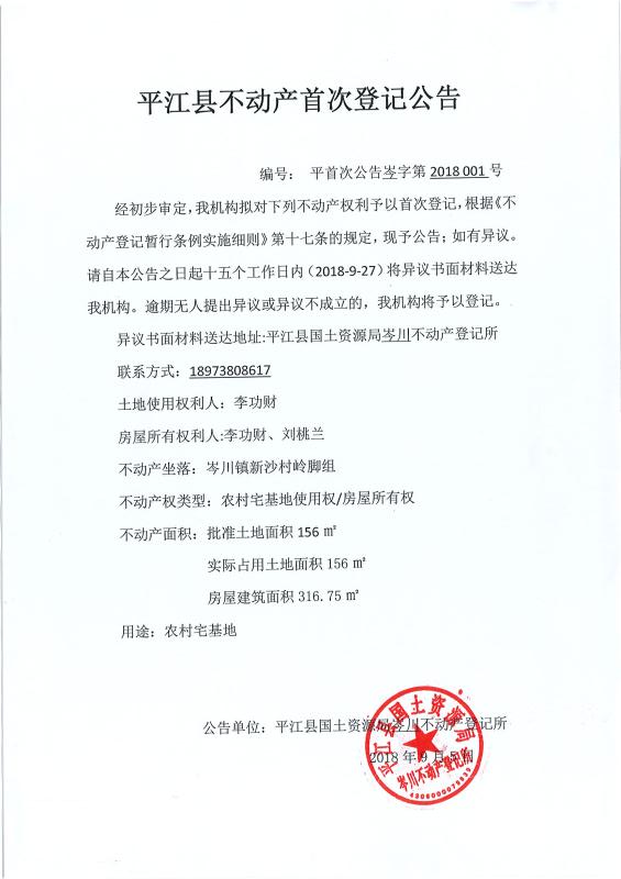 李功财 刘桃兰不动产首次登记公告平首次公告岑字第2018001号