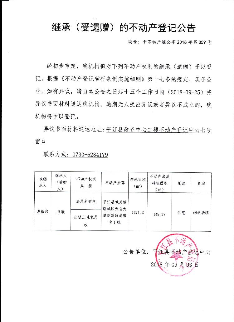 袁媛继承(受遗赠)的不动产登记公告平不动产继公字2018年第059号