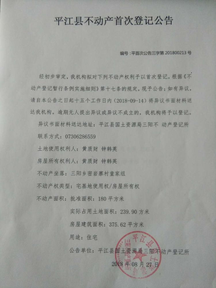三阳乡黄质财 钟韩英 不动产首次登记公告