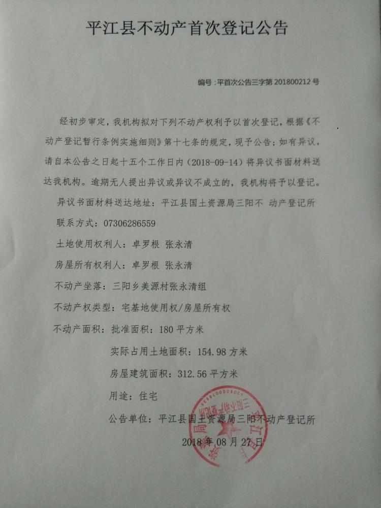 三阳乡卓罗根 张永清 不动产首次登记公告