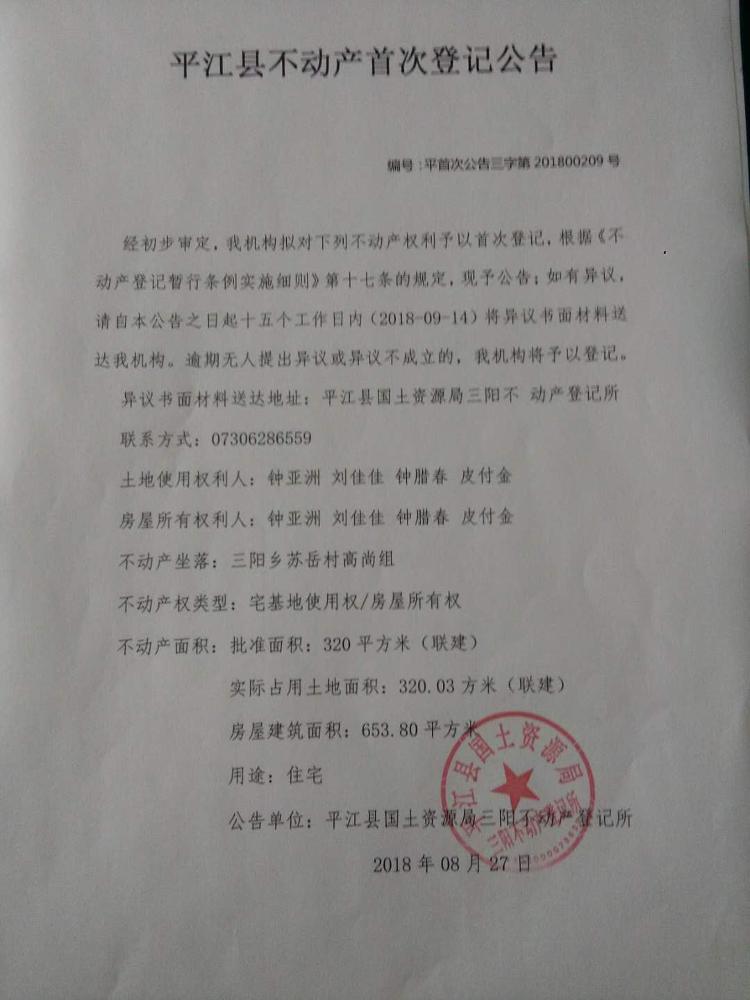 三阳乡钟亚洲 刘佳佳 钟腊春 皮付金 不动产首次登记公告