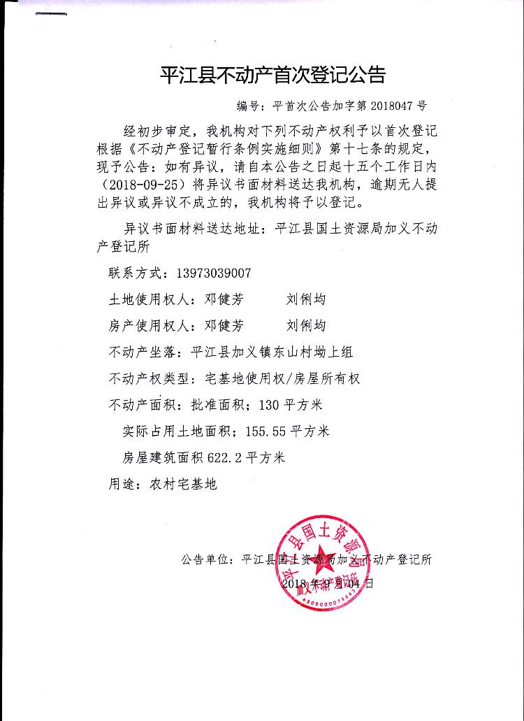 邓健芳 刘俐均不动产首次登记公告平首次公告加字第2018047号