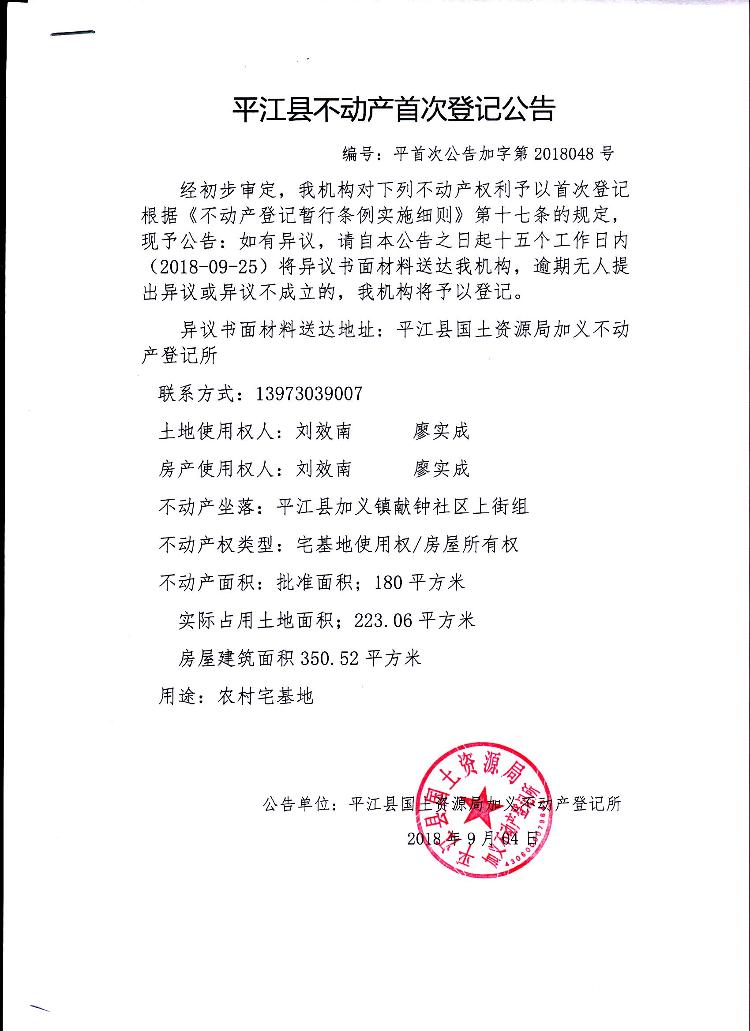 刘效南 廖实成不动产首次登记公告平首次公告加字第2018048号