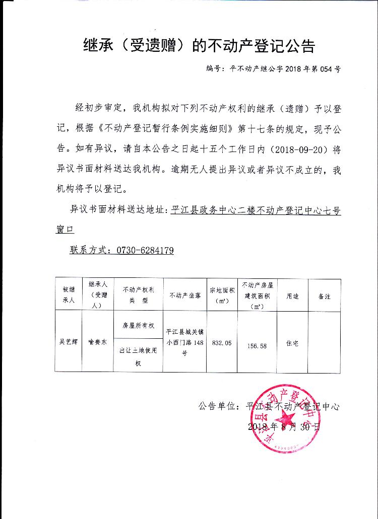 喻赉东继承(受遗赠)的不动产登记公告平不动产继公字2018年第054号
