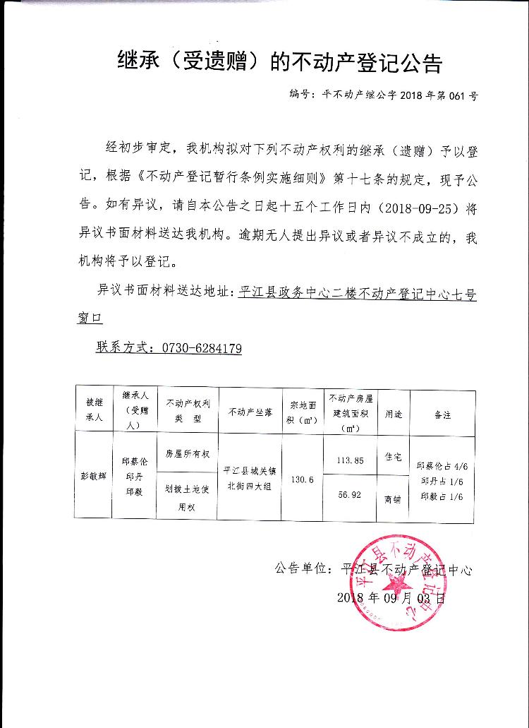 邱蔡伦 邱丹 邱毅继承(受遗赠)的不动产登记公告平不动产继公字2018年第061号