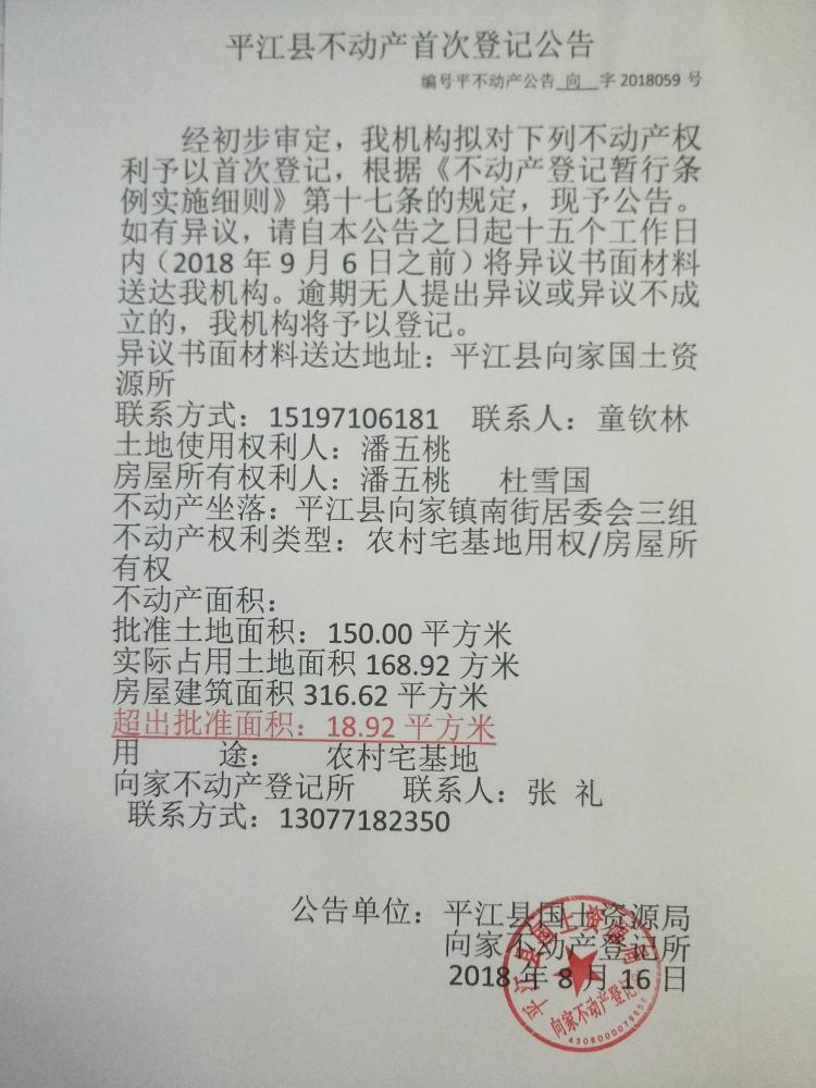 潘五桃 杜雪国不动产首次登记公告 向字2018059
