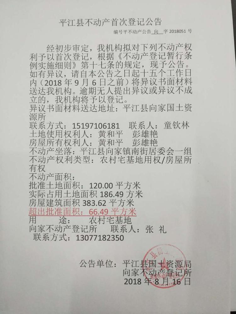 黄和平 彭雄艳不动产首次登记公告 向字2018051
