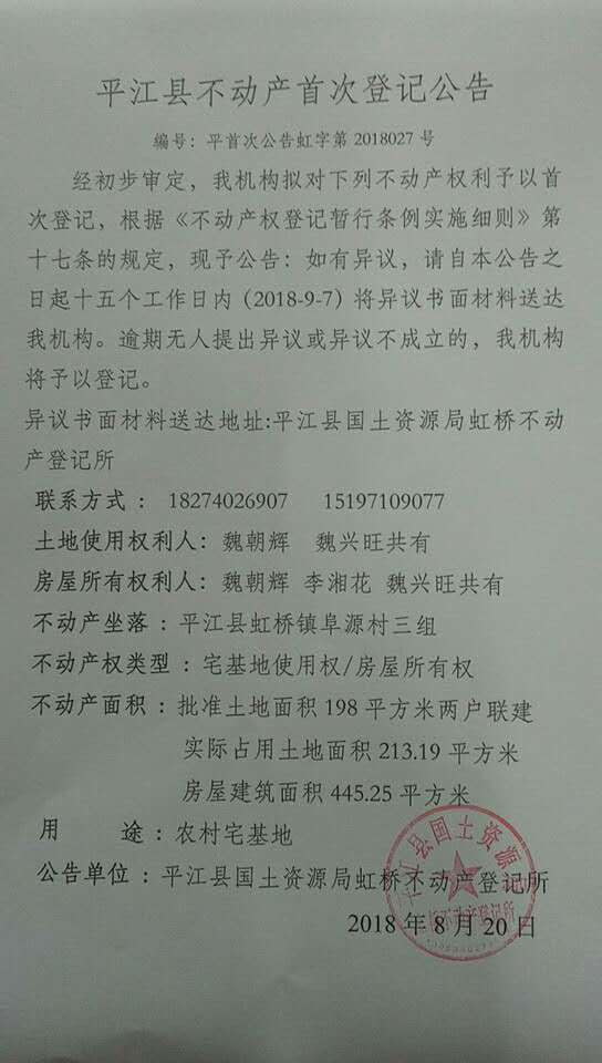 魏朝辉 李湘花 魏兴旺不动产首次登记公告平首次公告虹字第2018027号