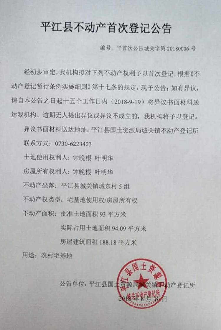 钟晚根 叶明华不动产首次登记公告平首次公告城关字第20180006号