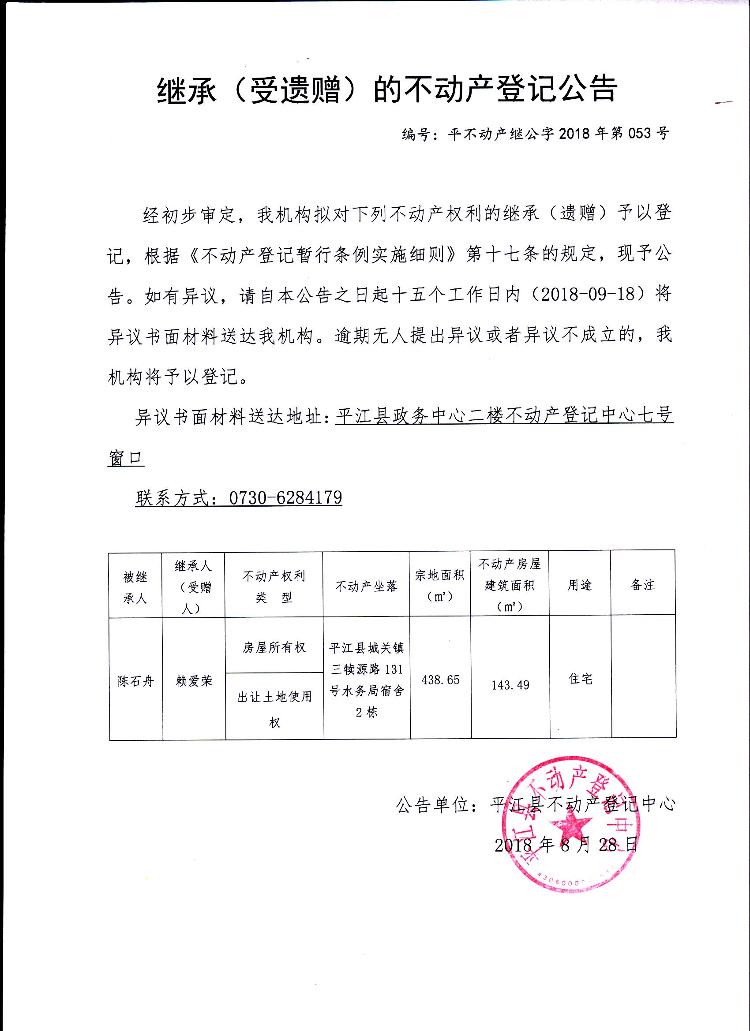 赖爱荣继承(受遗赠)的不动产登记公告平不动产继公字2018年第053号
