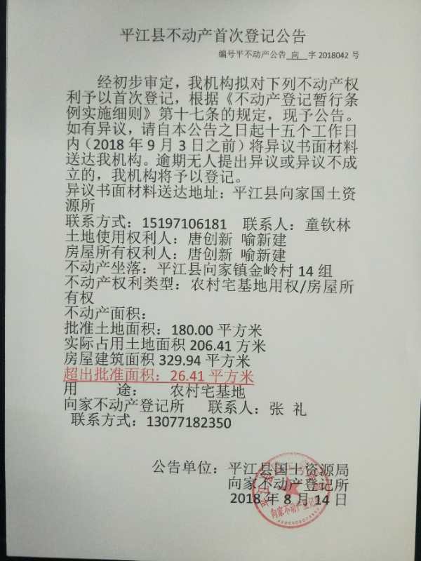 唐创新 喻新建不动产首次登记公告 向字2018042号