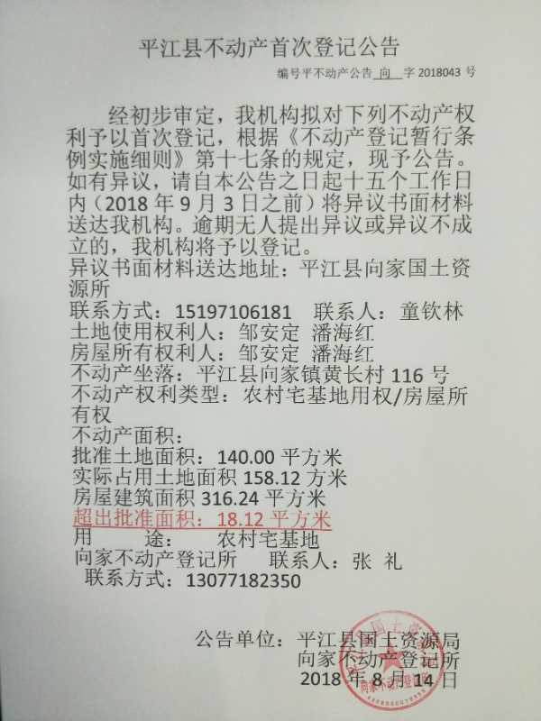 邹安定 潘海红不动产首次登记公告 向字2018043号