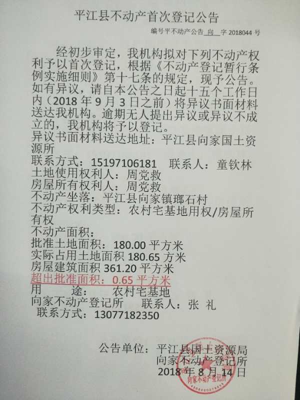 周党救不动产首次登记公告 向字2018044号