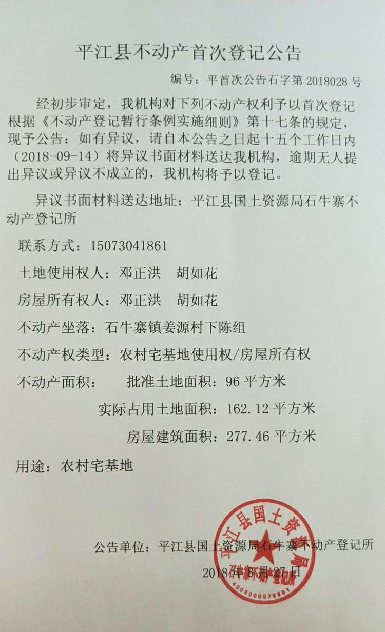 邓正洪 胡如花不动产首次登记公告平首次公告石字第2018028号
