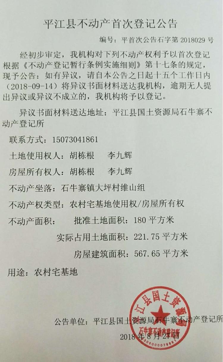 胡栋根 李九辉不动产首次登记公告平首次公告石字第2018029号