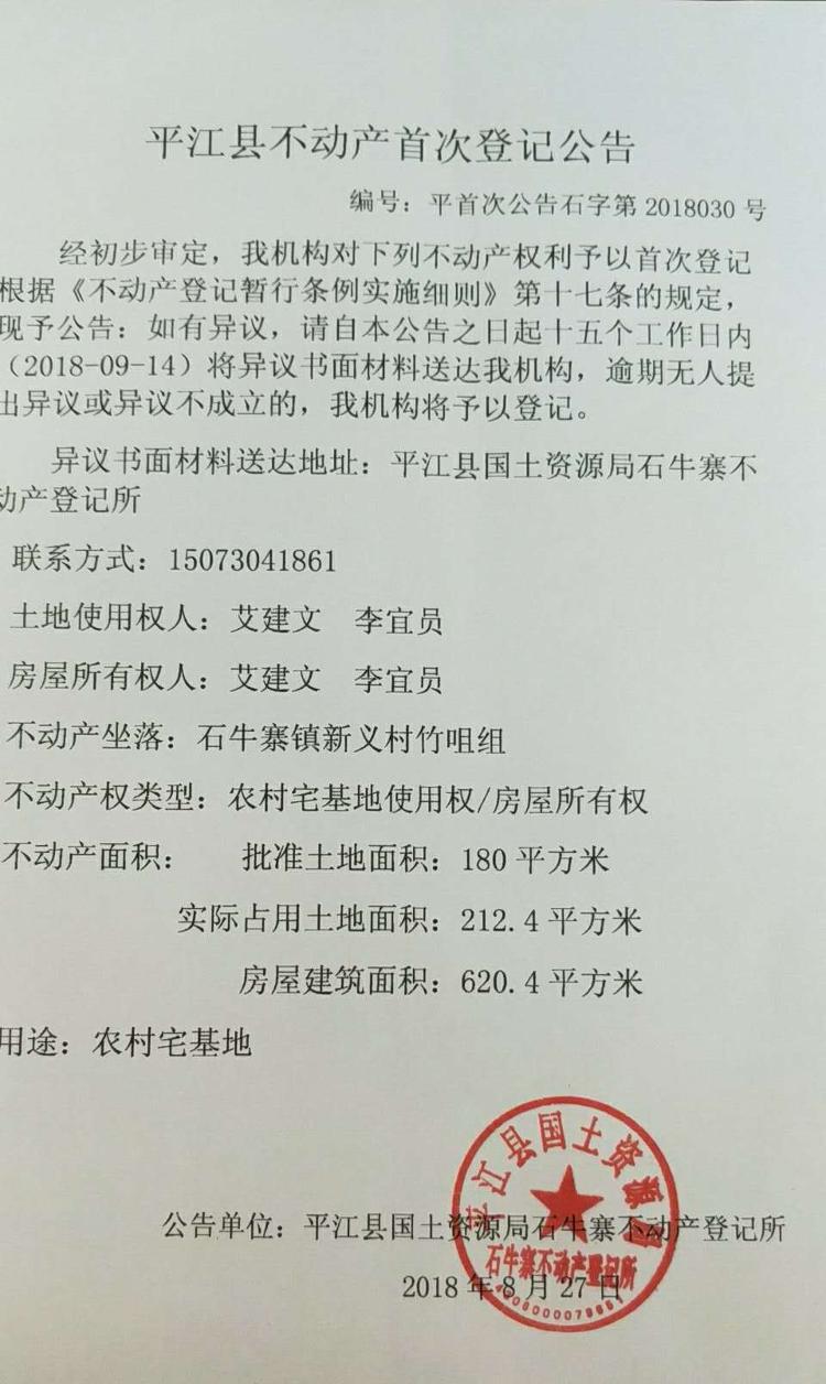 艾建文 李宜员不动产首次登记公告平首次公告石字第2018030号