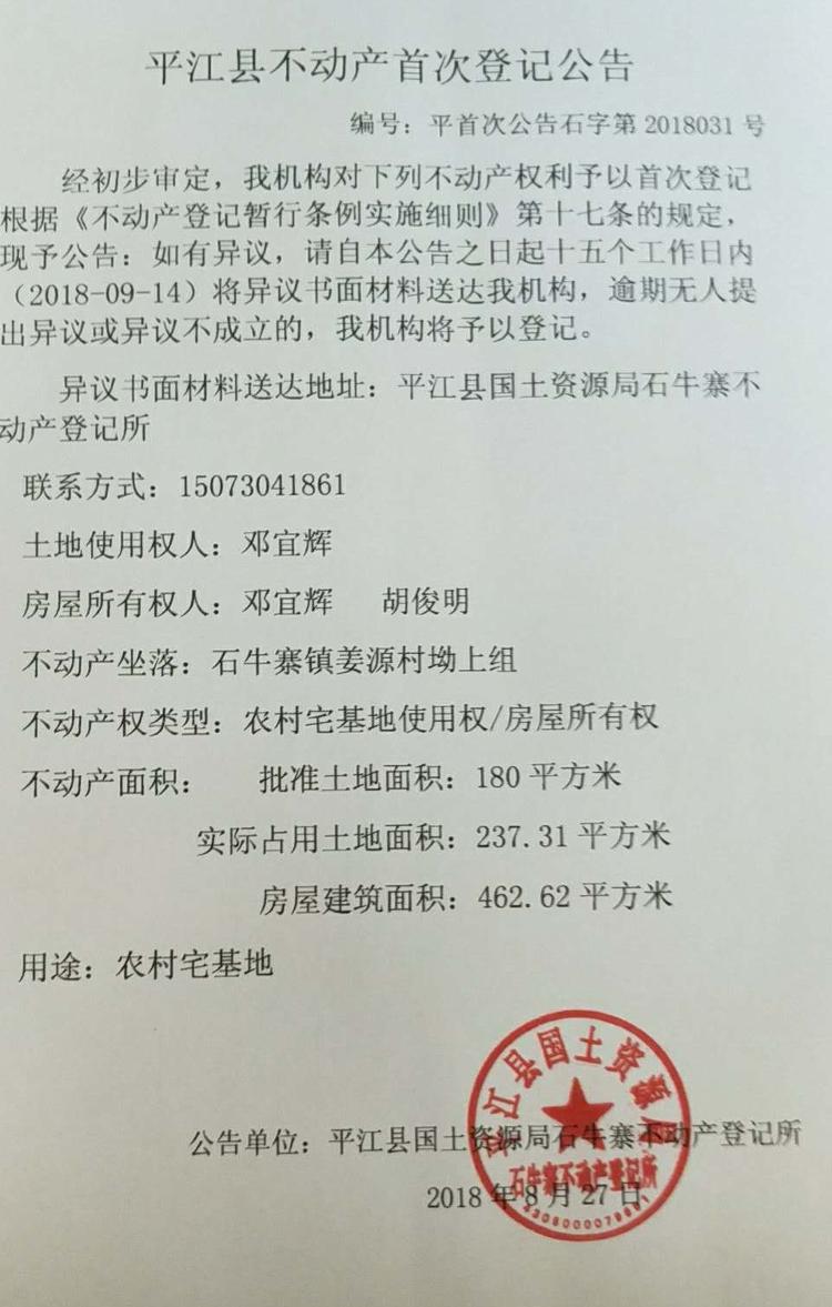 邓宜辉 胡俊明不动产首次登记公告平首次公告石字第2018031号