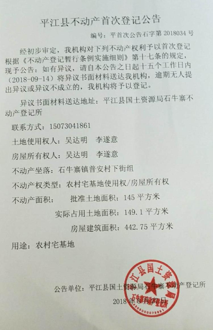 吴达明 李遂意不动产首次登记公告平首次公告石字第2018034号