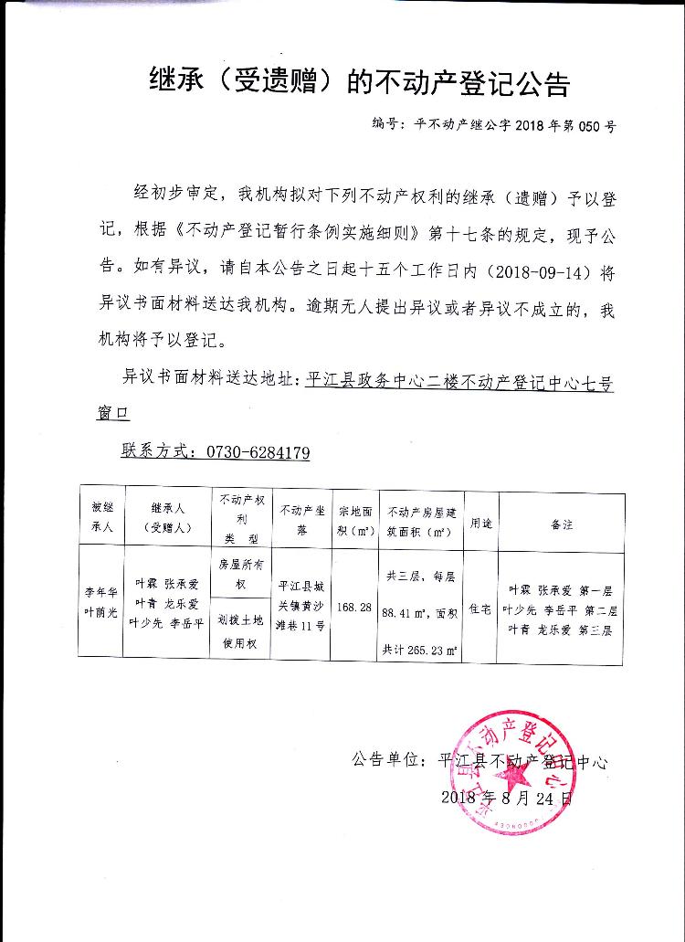 叶霖 张承爱 叶青 龙乐爱 叶少先 李岳平继承(受遗赠)的不动产登记公告平不动产继公字2018年第050号