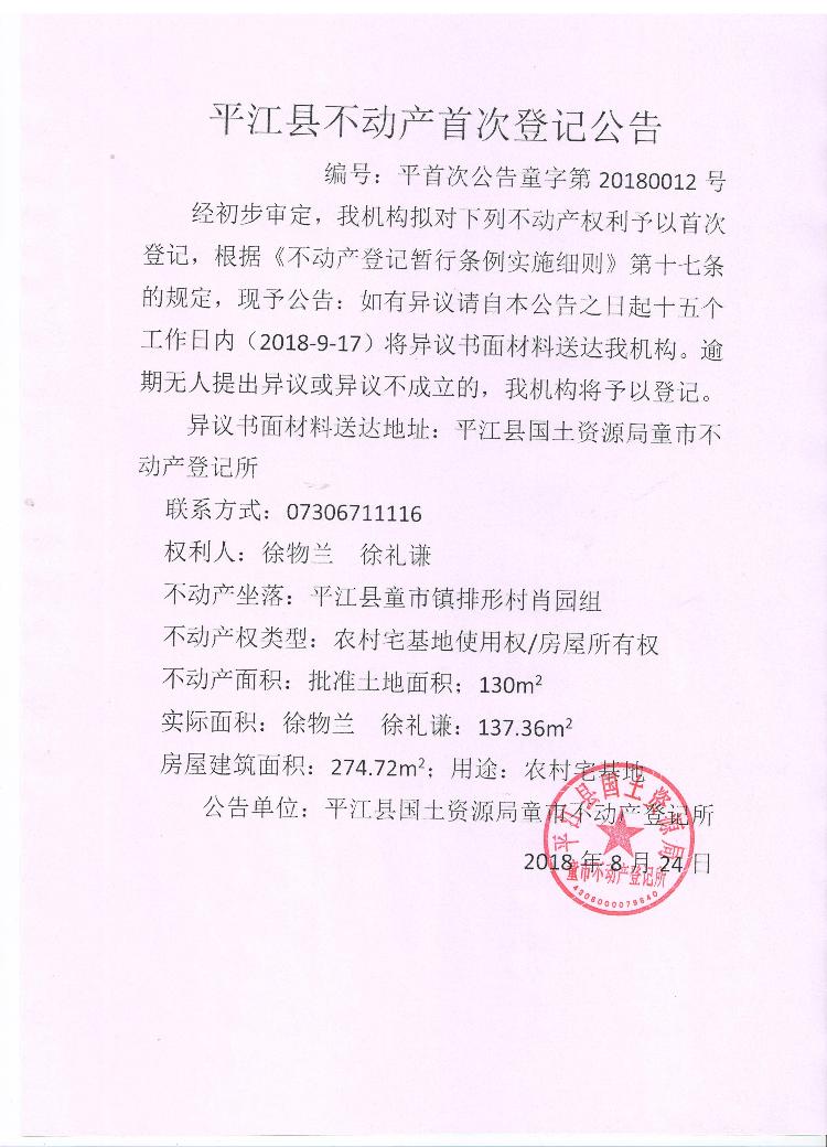 徐物兰 徐礼谦不动产首次登记公告平首次公告童字第20180012号