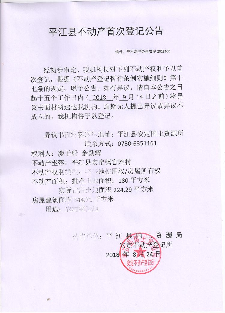 凌于船 余勤辉不动产首次登记公告 安字2018100