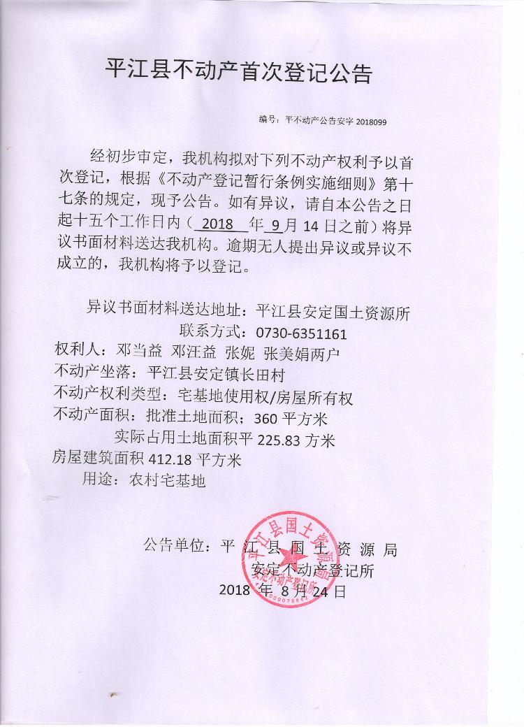 邓当益 邓汪益 张妮 张美娟不动产首次登记公告 安字2018099