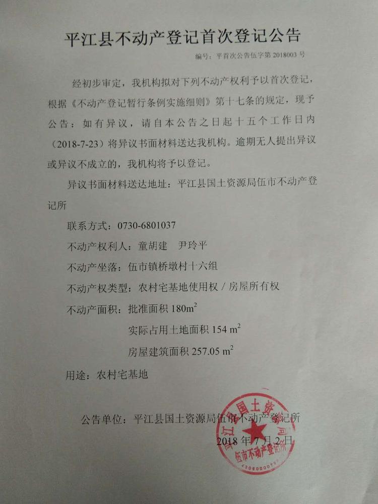 童胡建 尹玲平不动产首次登记公告平首次公告伍字第2018003号
