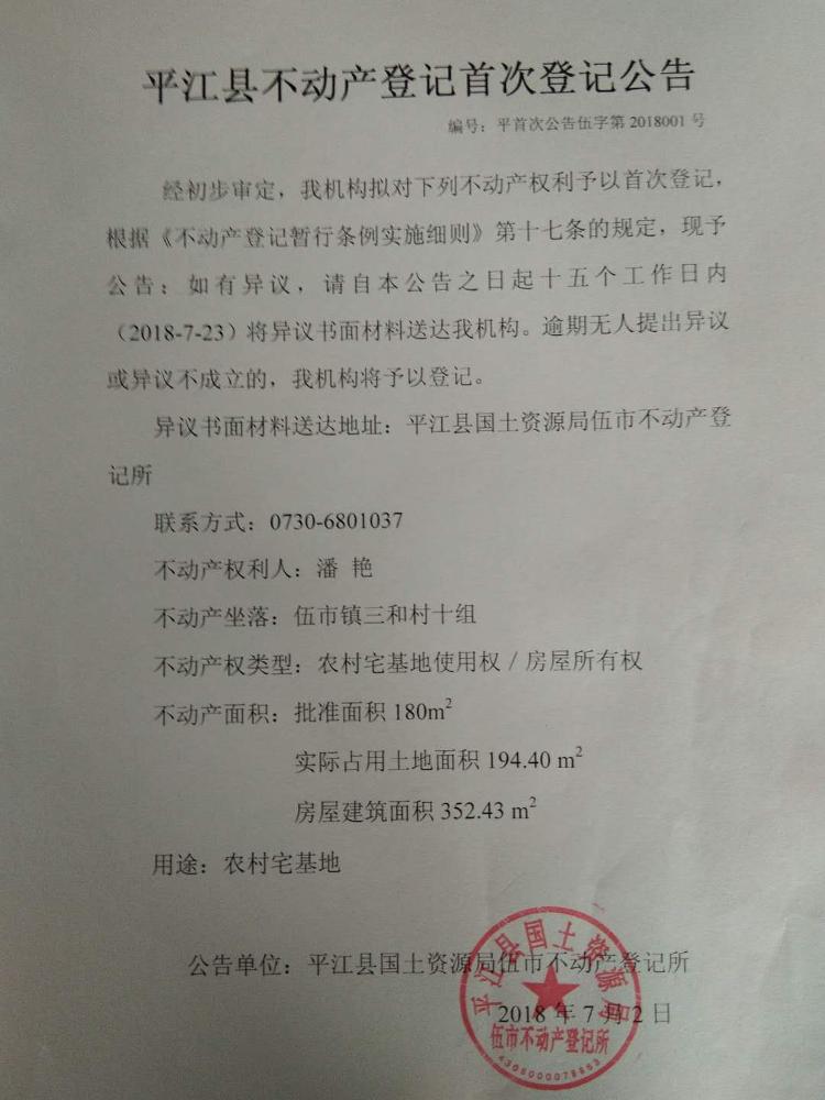 潘艳不动产首次登记公告平首次公告伍字第2018001号
