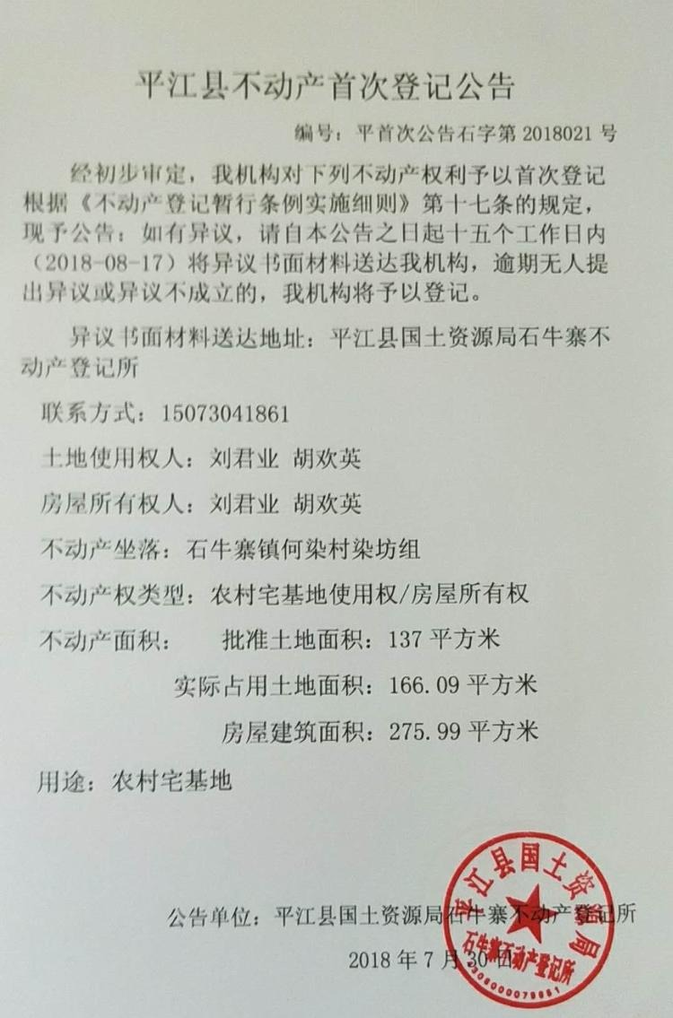 刘君业 胡欢英不动产首次登记公告平首次公告石字第2018021号