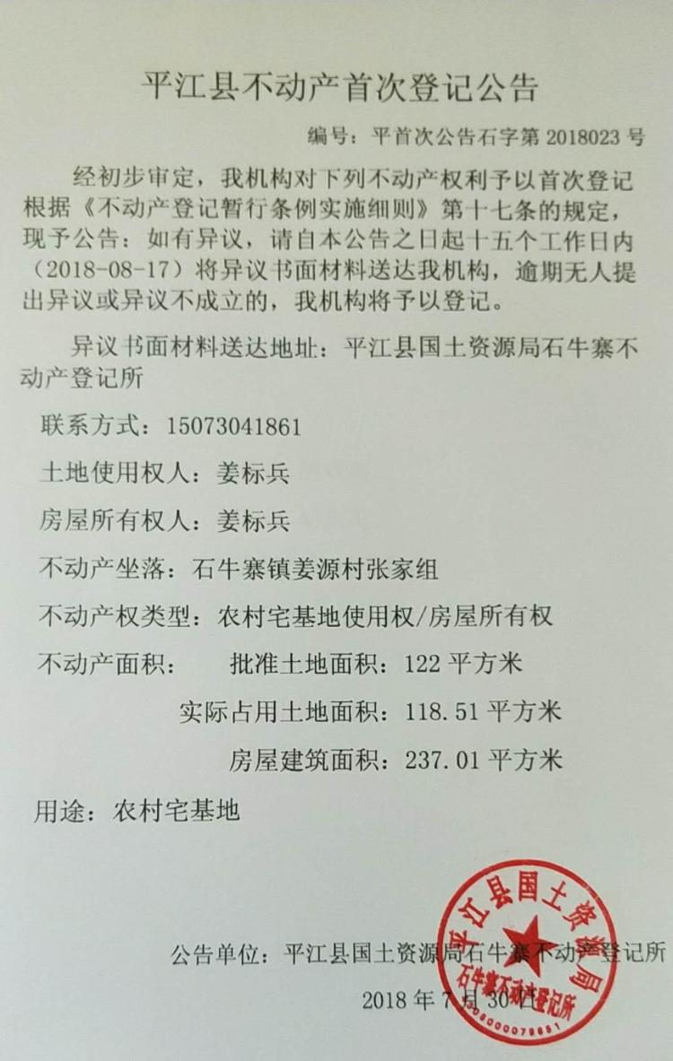 姜标兵不动产首次登记公告平首次公告石字第2018023号