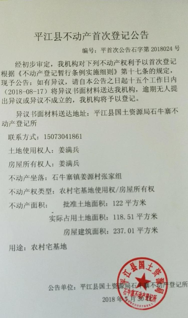姜满兵不动产首次登记公告平首次公告石字第2018024号