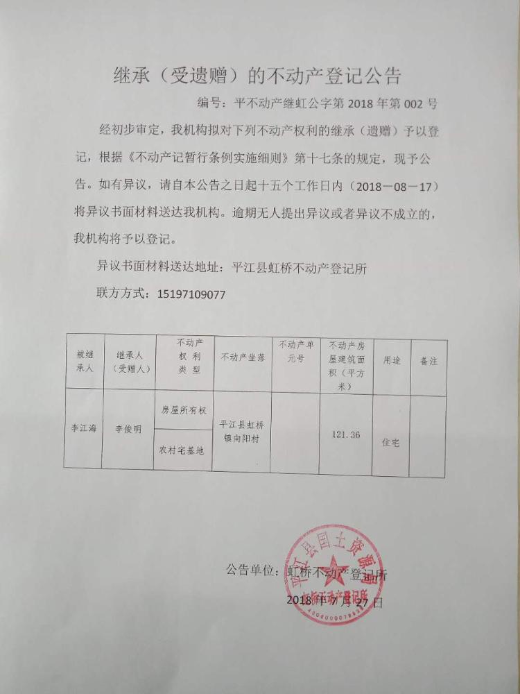 李俊明继承(受遗赠)的不动产登记公告平不动产继虹公字第2018年第002号