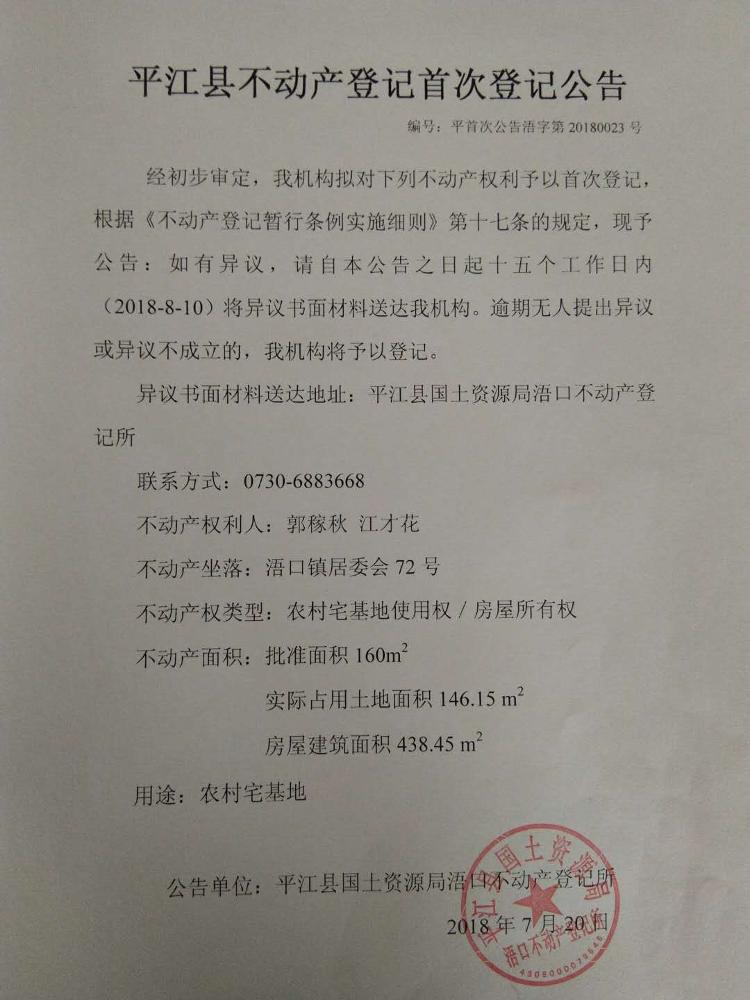 郭稼秋 江才花不动产首次登记公告平首次公告浯字第20180023号