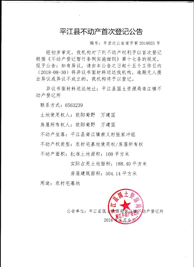 欧阳菊野 万建国平江县不动产首次登记公告平首次公告南字第2018025号